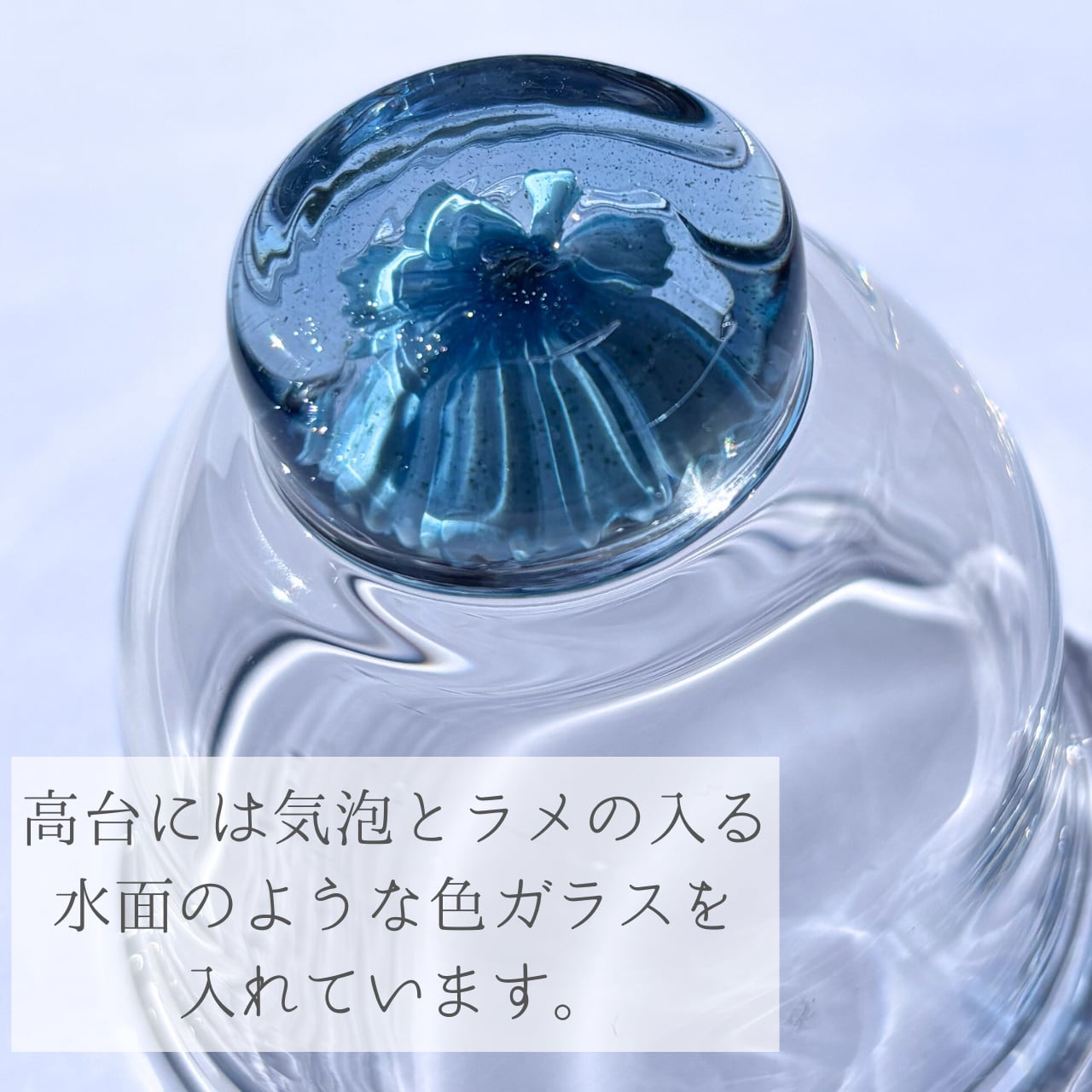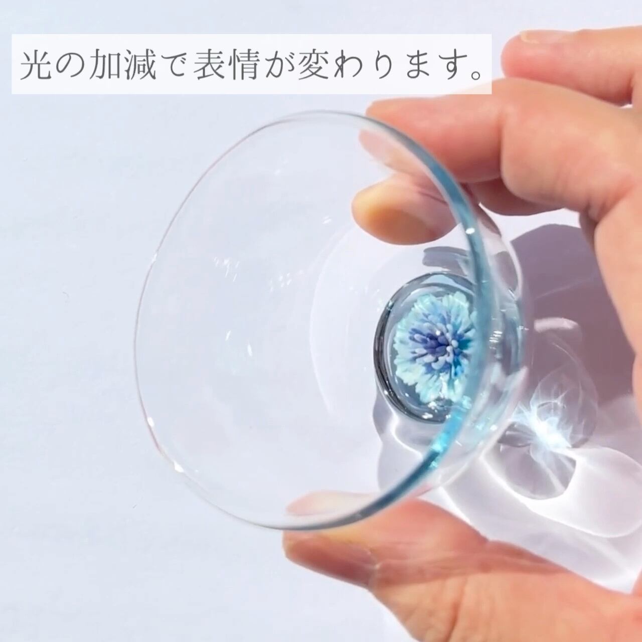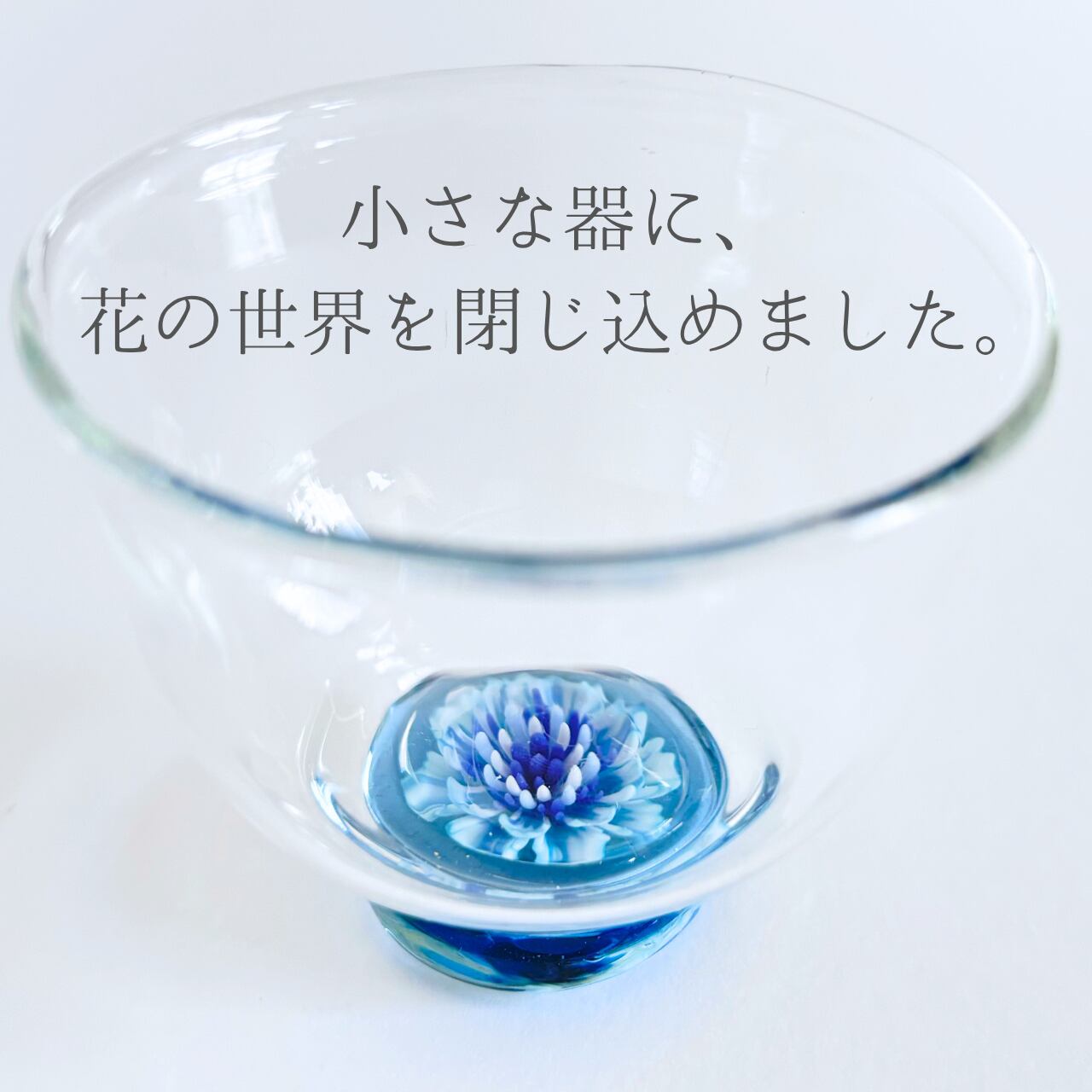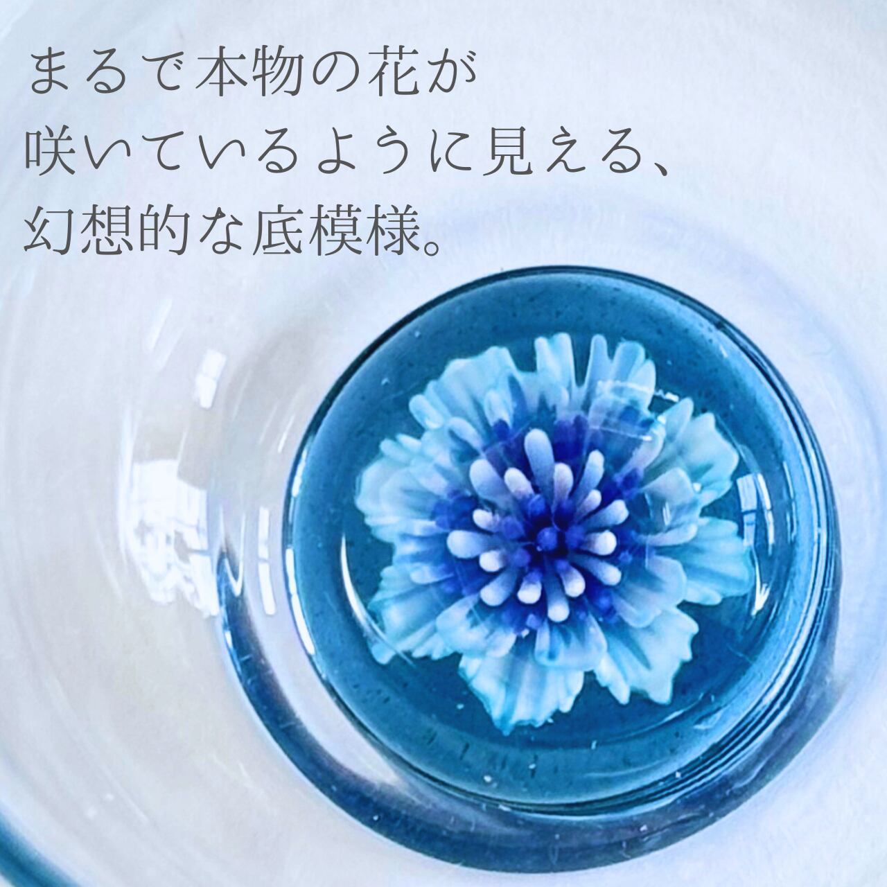 青、水色、白を基調とした、涼やかな花がグラスの底にそっと咲いています。