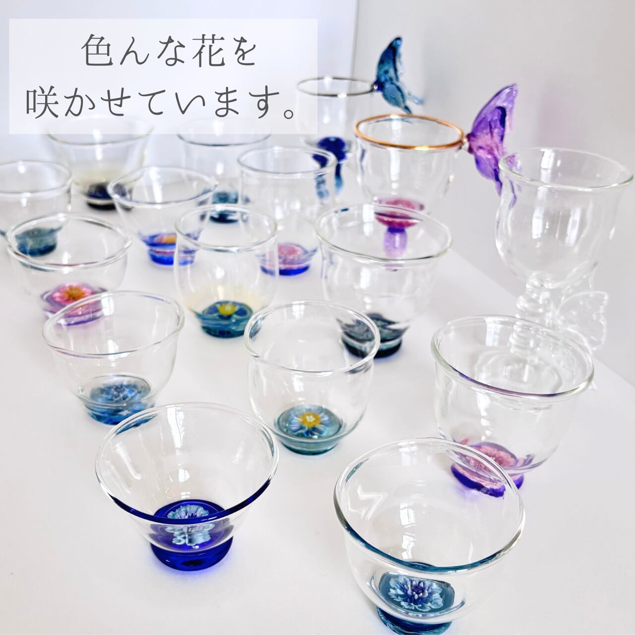 グラスの中に咲く花はすべて一点もので、色や形に個性があります。