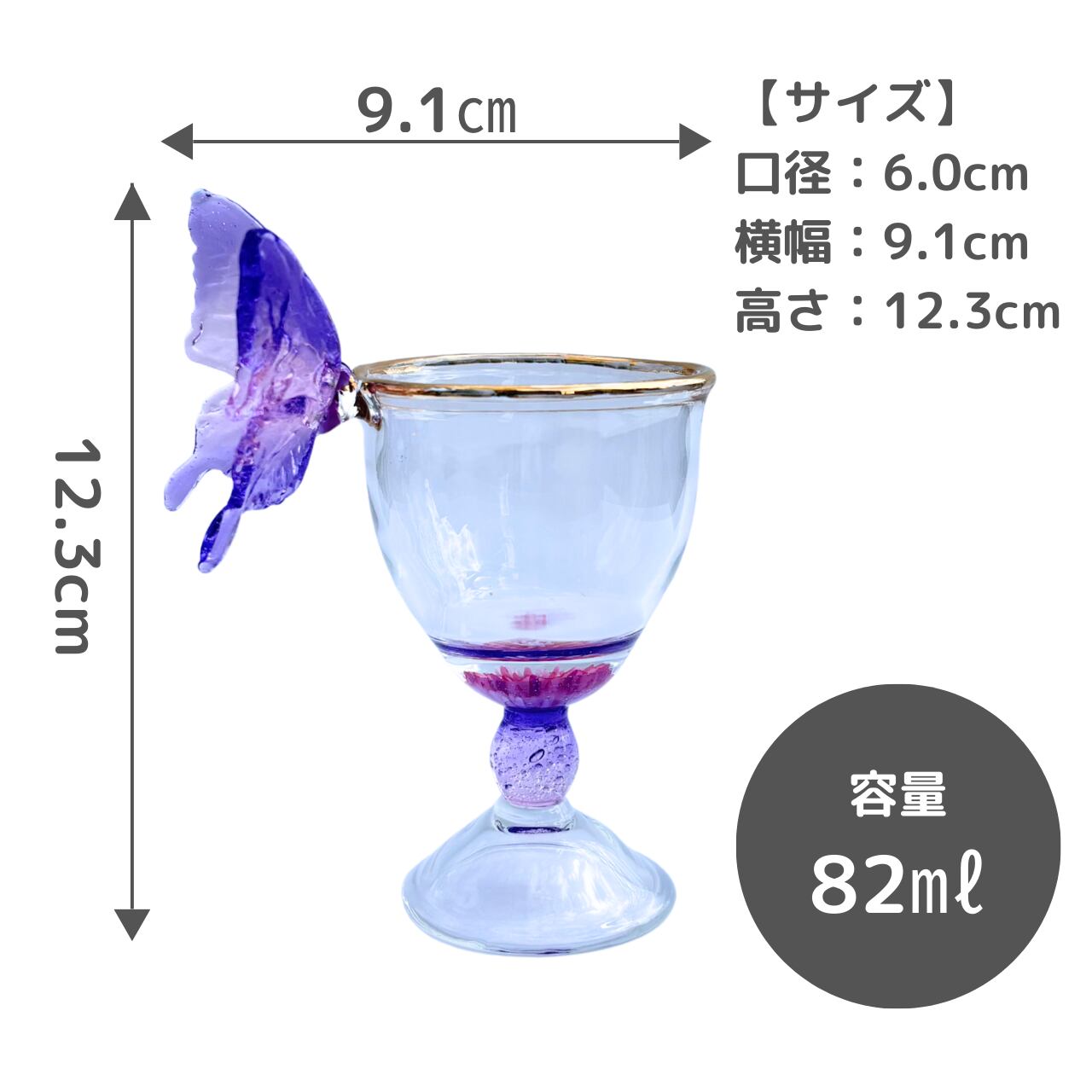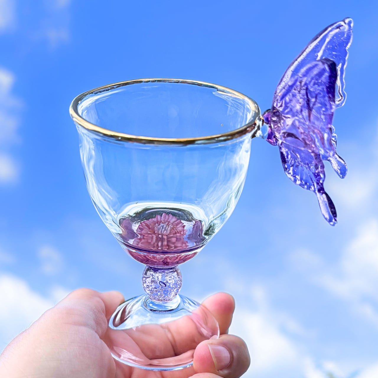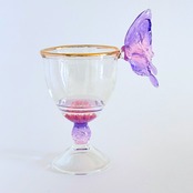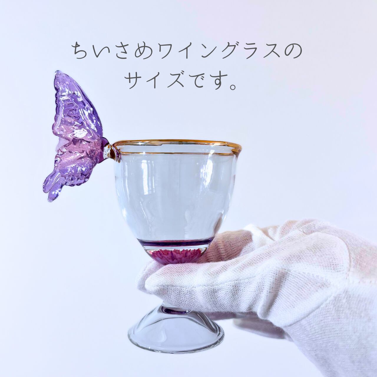 薄紫とピンクのグラデーションの蝶々が、縁にひらりと舞い降りた、小さめワイングラスの形の酒器です。