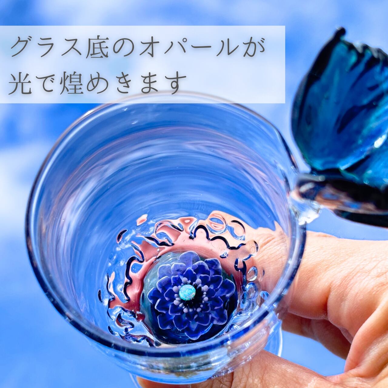 底には透き通る青の花が咲き、その中央には人工オパールを忍ばせました。