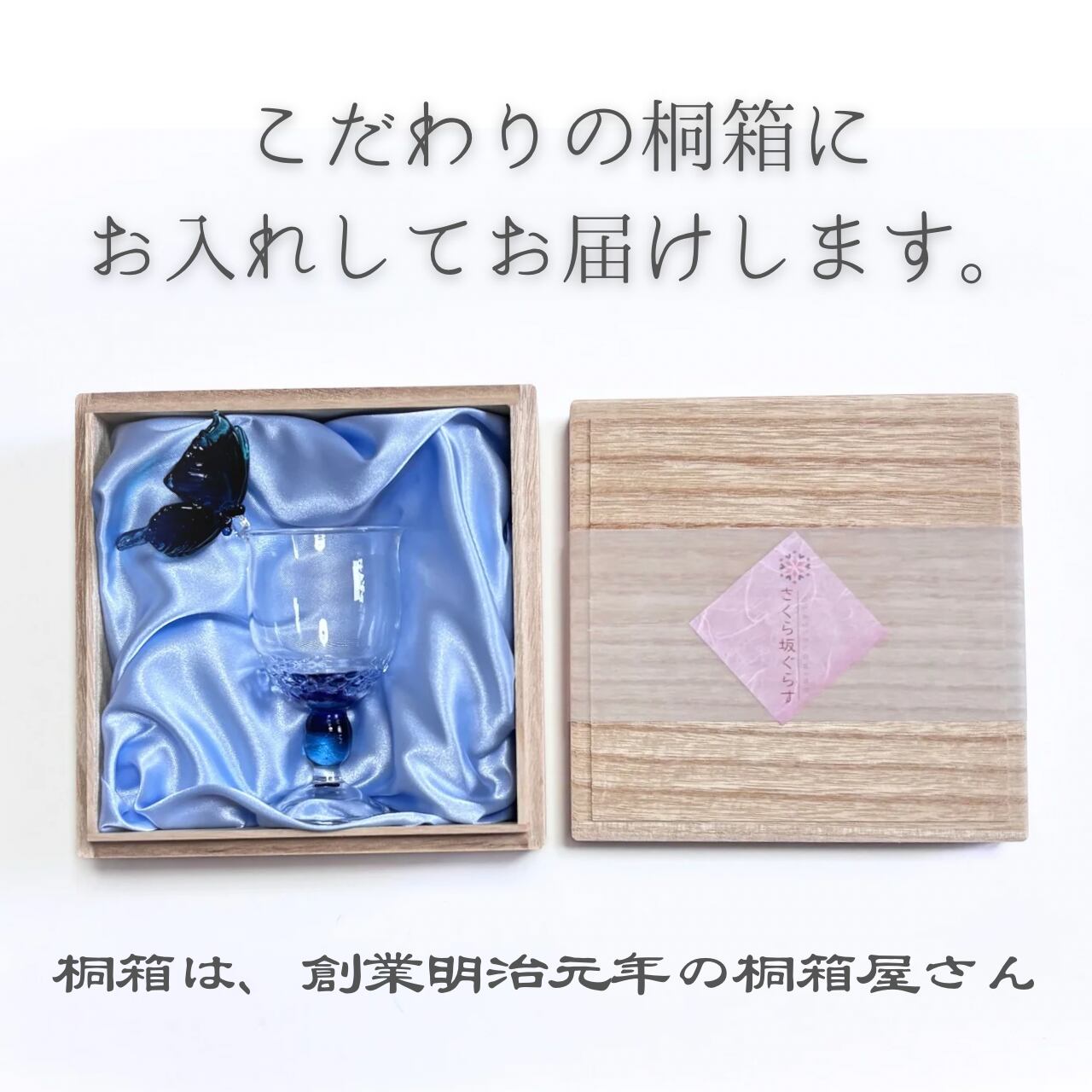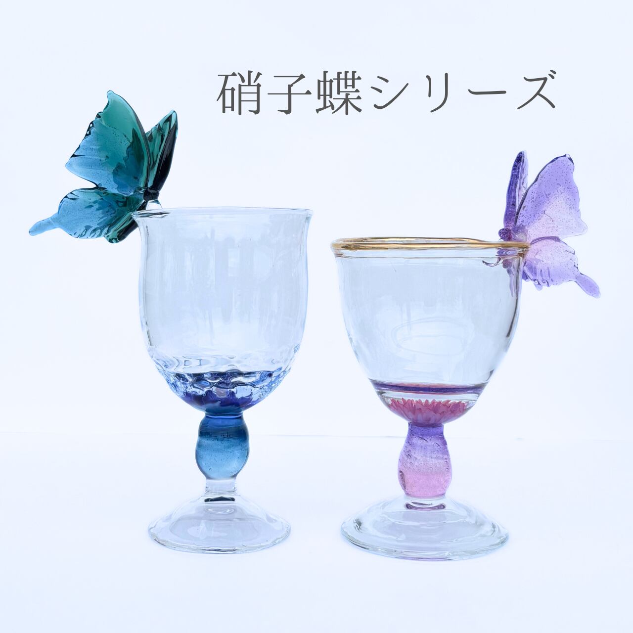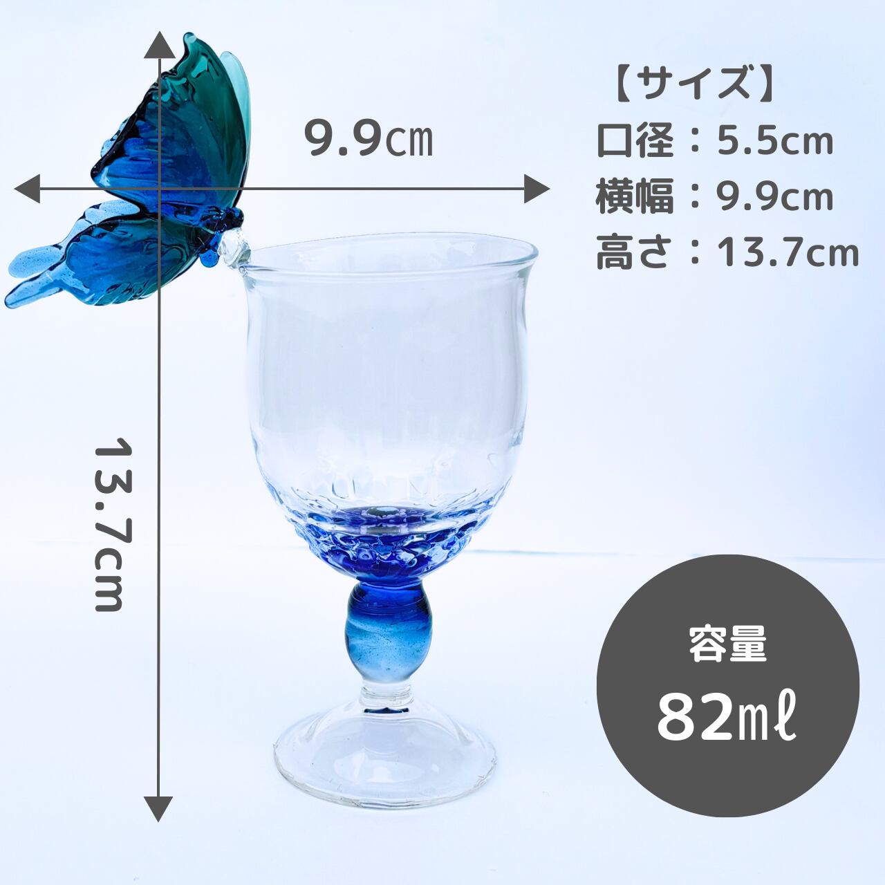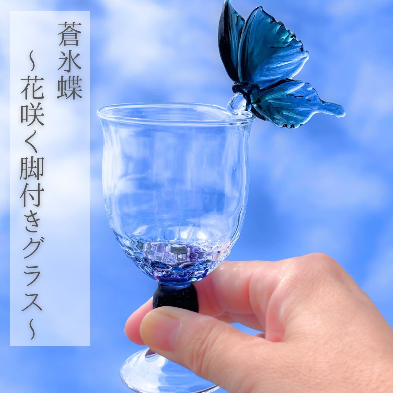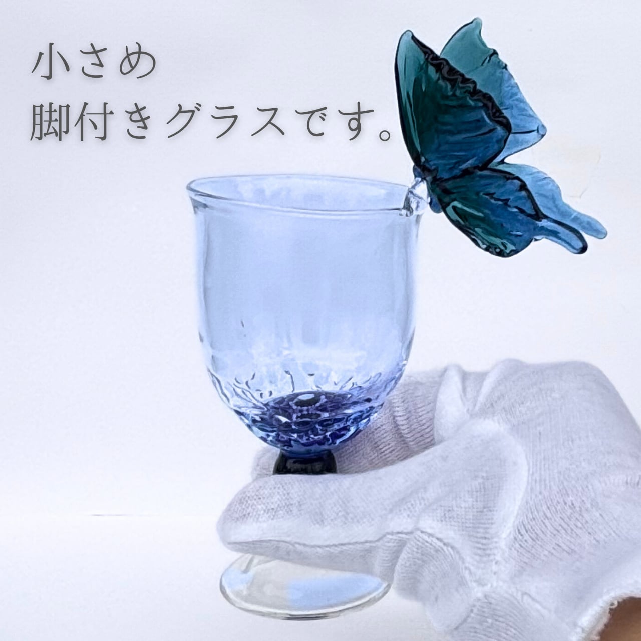 深緑から青へのグラデーションを纏った蝶々が舞う、ワイングラス型の脚付き酒器です。