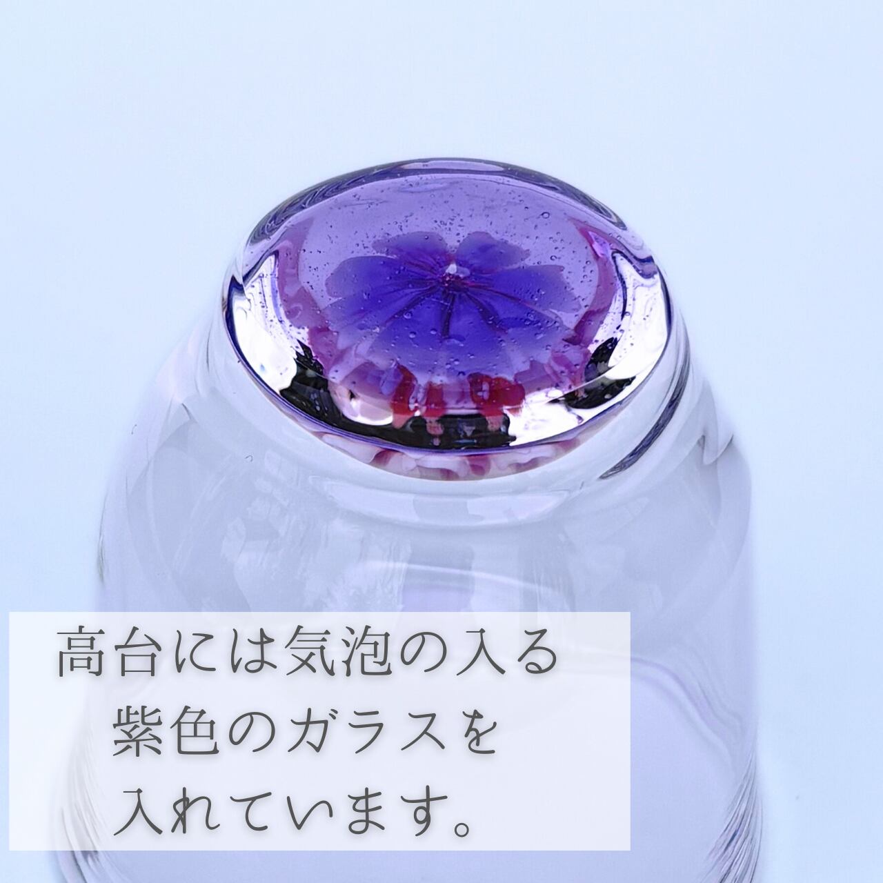 バックには、気泡を含んだ薄紫色のガラスを重ね、花が水中で静かに浮かんでいるような表情に仕上げています。