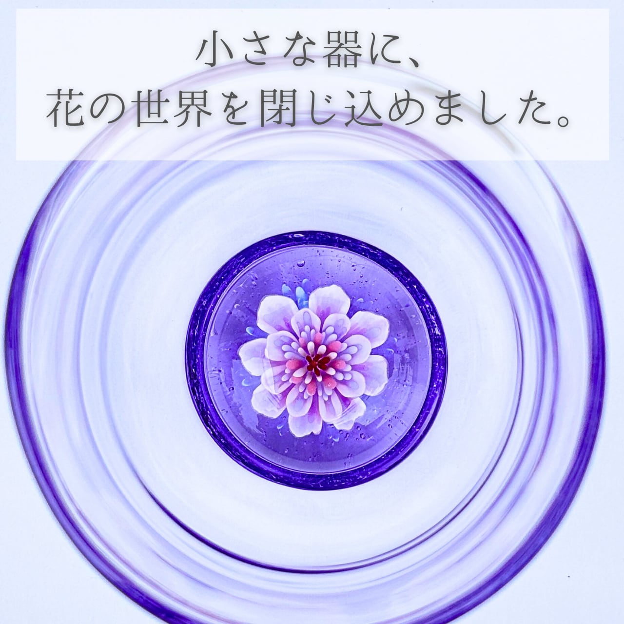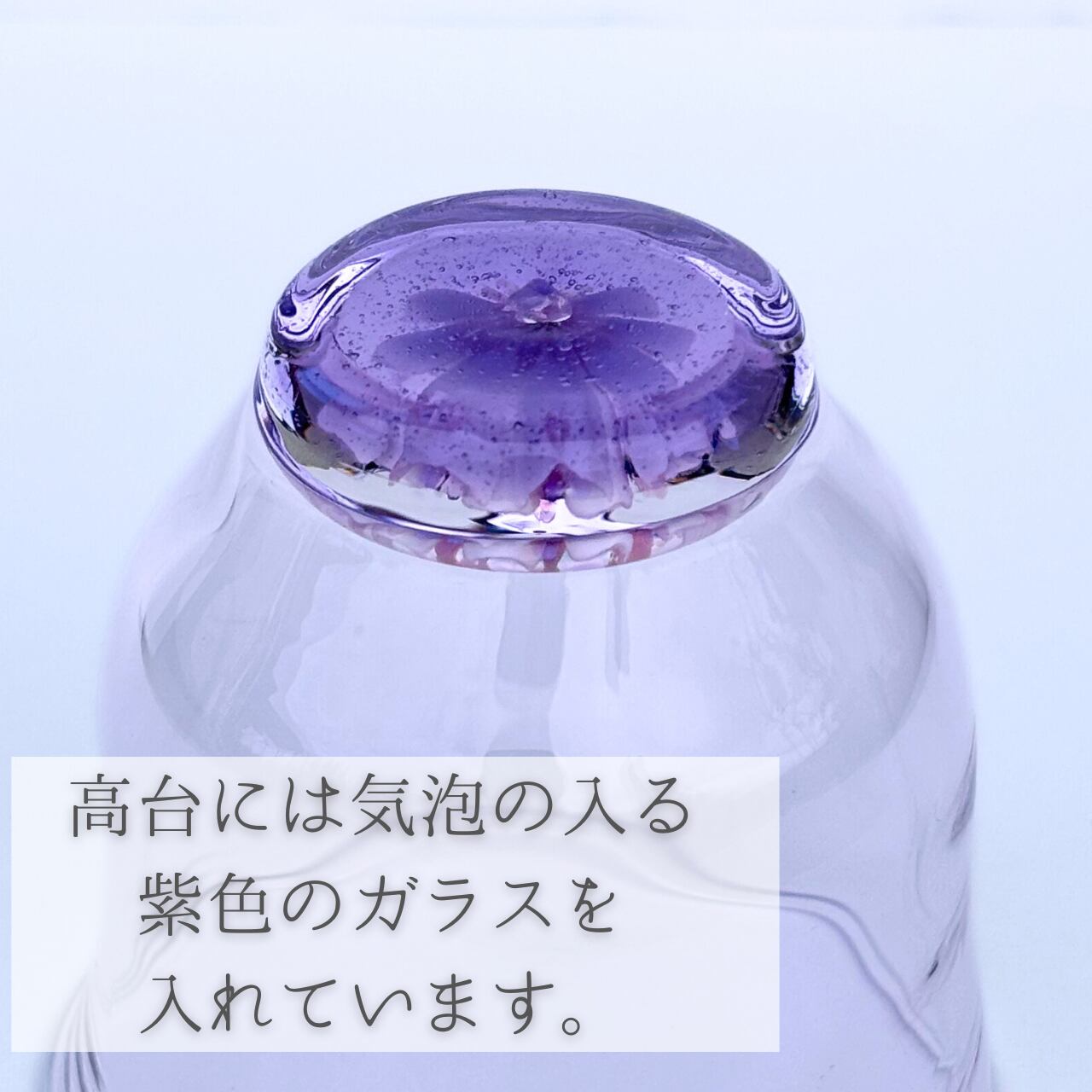 バックには、気泡を含んだ薄紫色のガラスを重ね、花が水中で静かに浮かんでいるような表情に仕上げています。