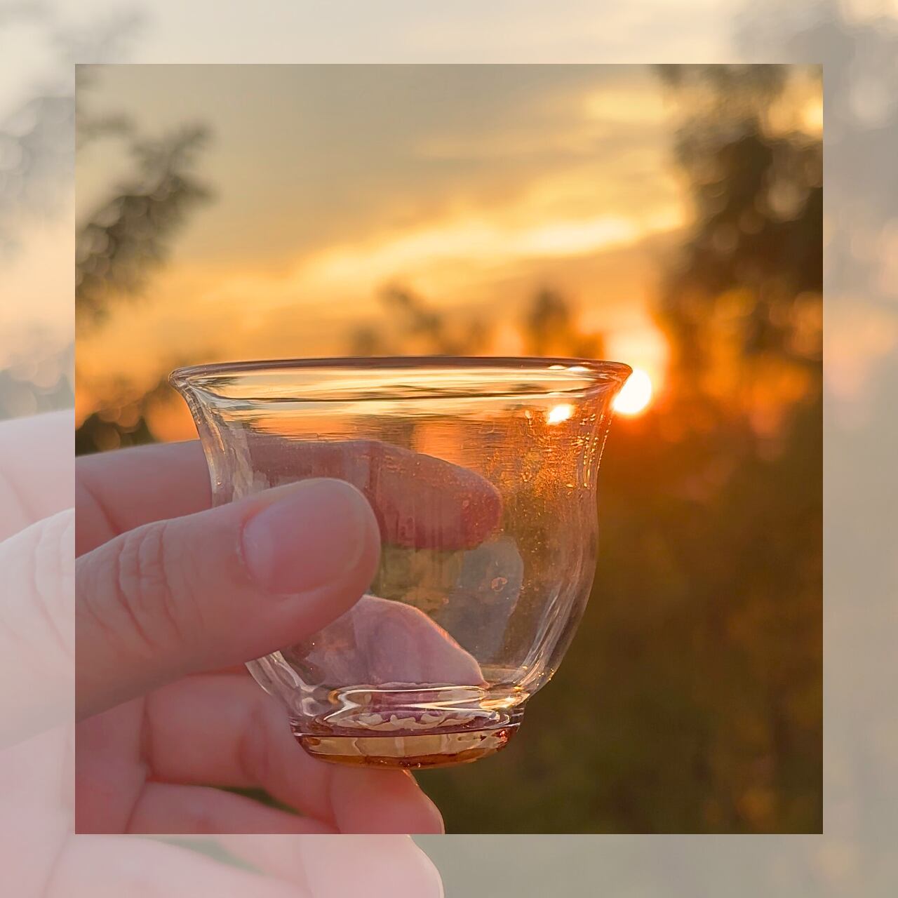 グラスの底に、橙や紅の花をそっと咲かせ、バックには秋の夕暮れを思わせる透き通るオレンジ色を重ねました。