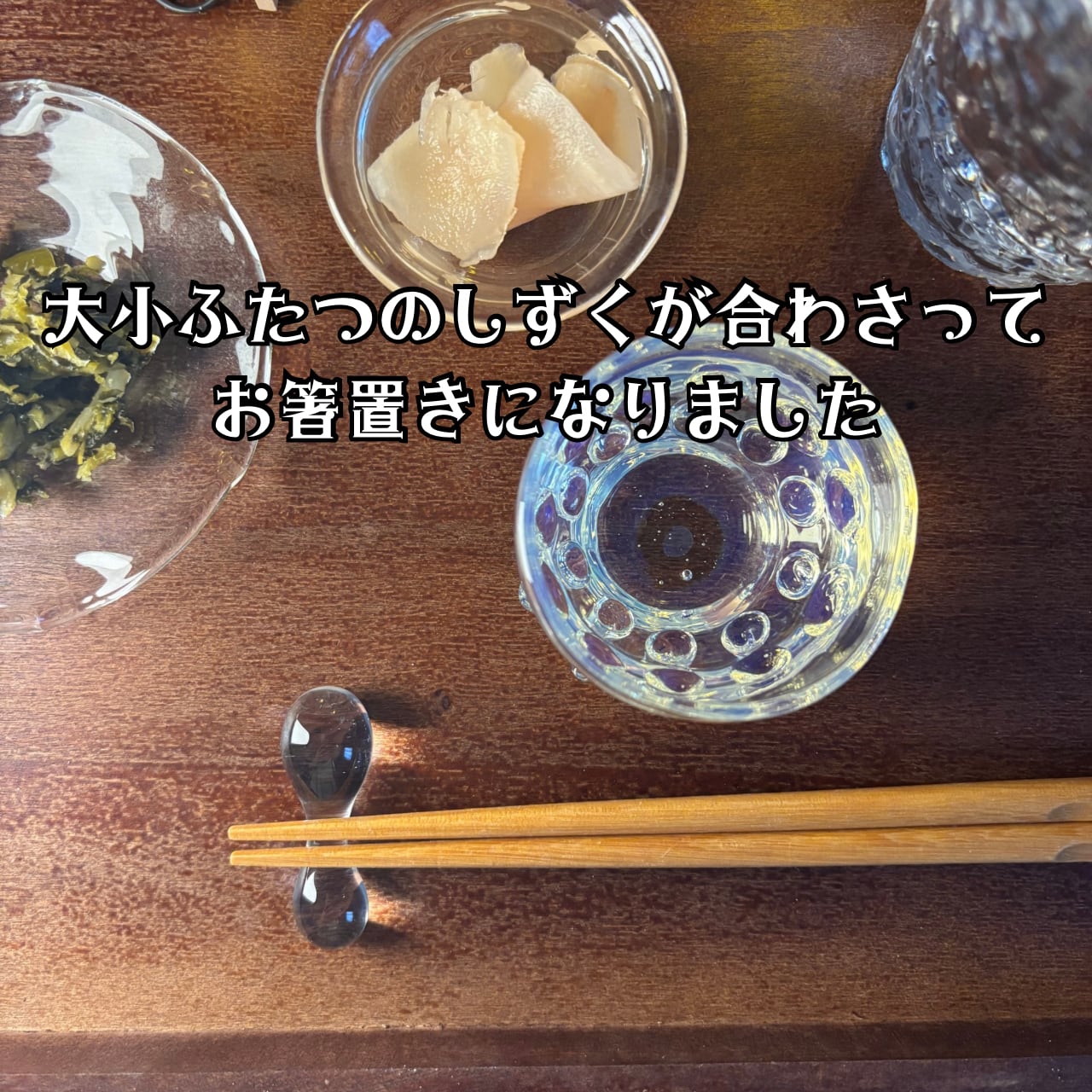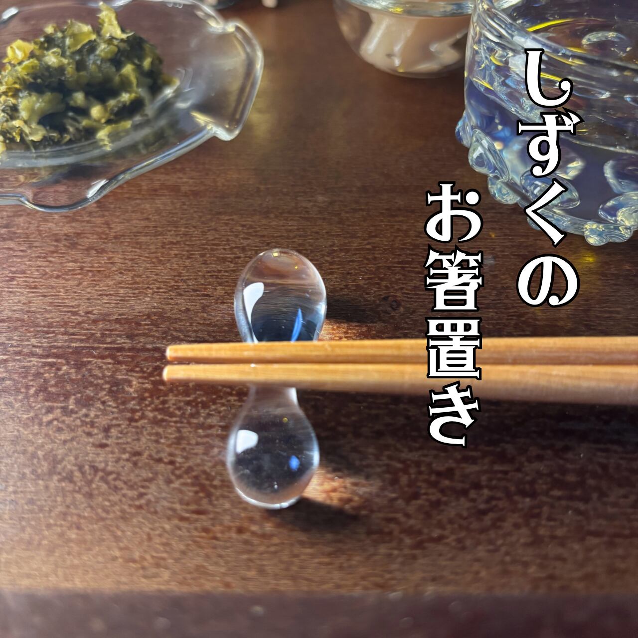 透明感のある耐熱ガラスを使い、大小ふたつのしずくが並んだデザインのお箸置き。