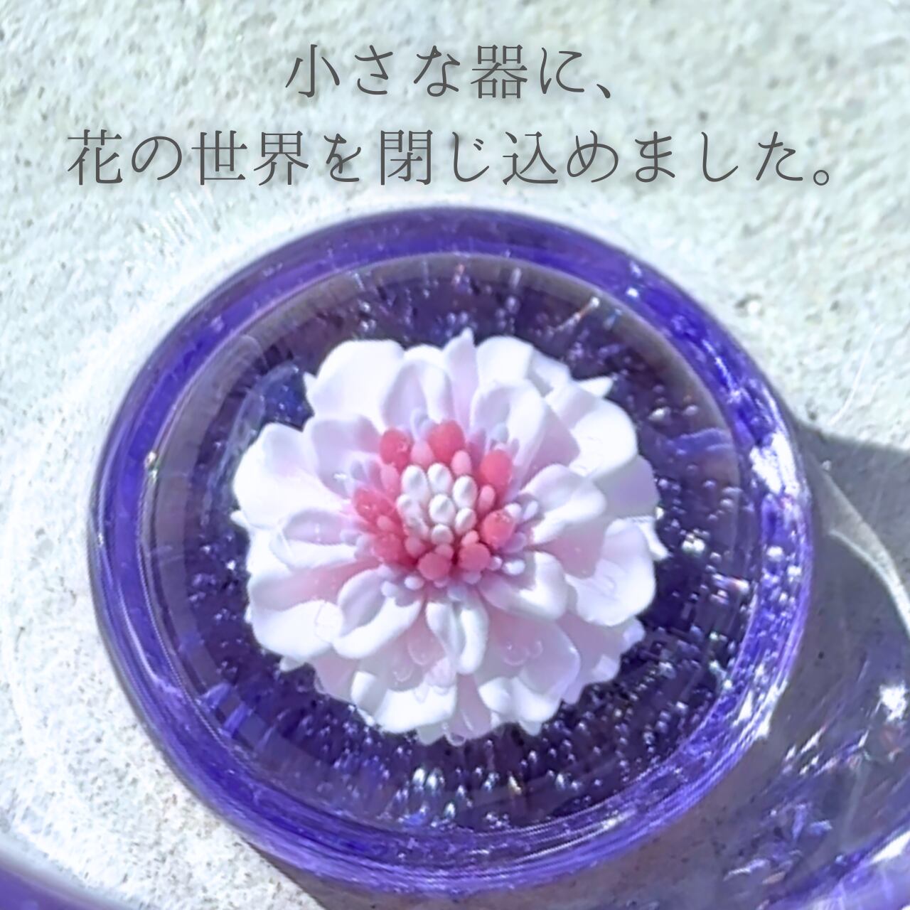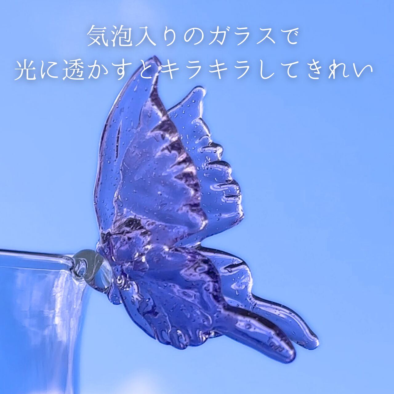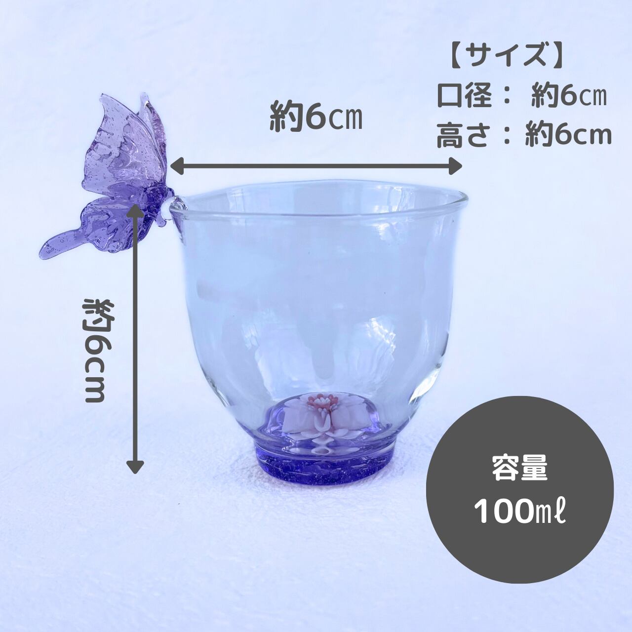 この作品は、耐熱ガラスを用いて一つ一つ丁寧に手作りされています。透明感が美しく、軽量で扱いやすさも兼ね備えています。底に咲く花や、蝶々のデザインは全て一点もので、個々に異なる魅力を楽しめます。