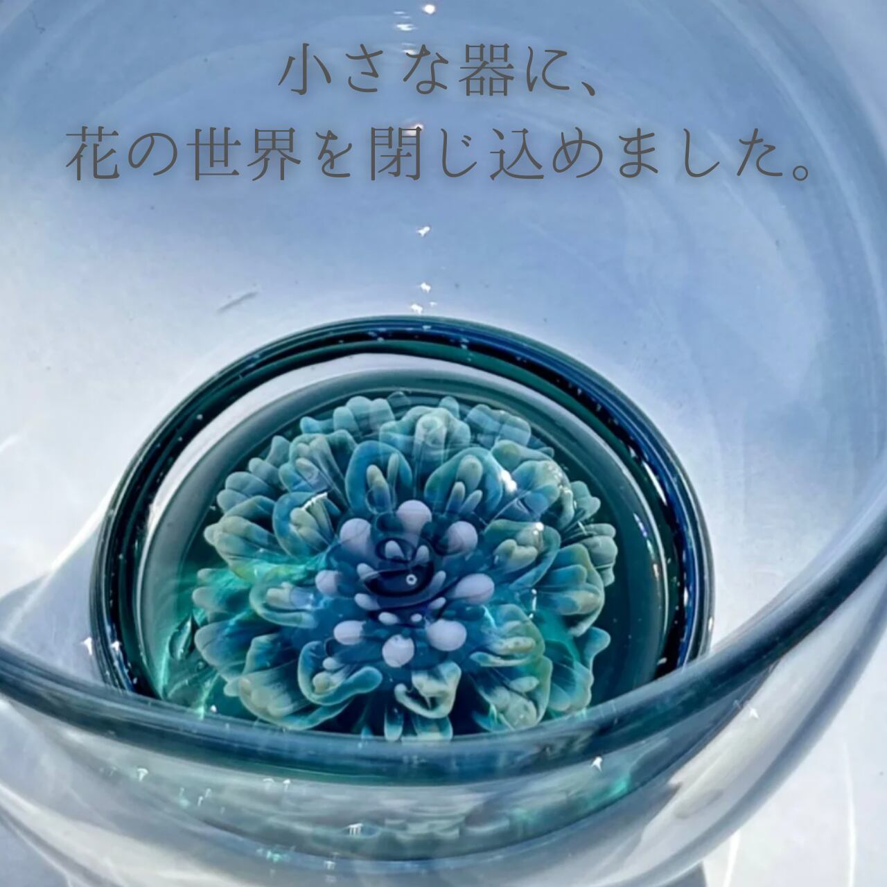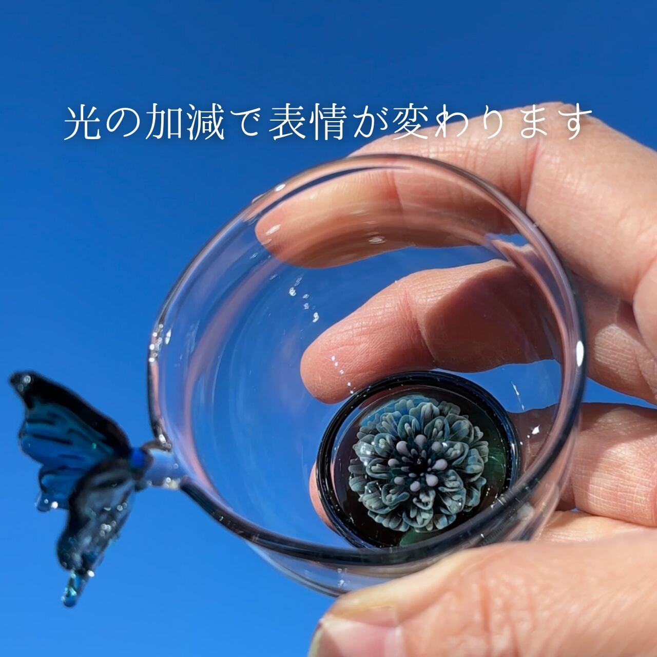 この作品は、耐熱ガラスを用いて一つ一つ丁寧に手作りされています。透明感のある青緑の美しさを持ち、軽量で扱いやすいのが特長です。底に咲く花や、蝶々のデザインは全て一点もので、個別に異なる魅力を楽しめます。