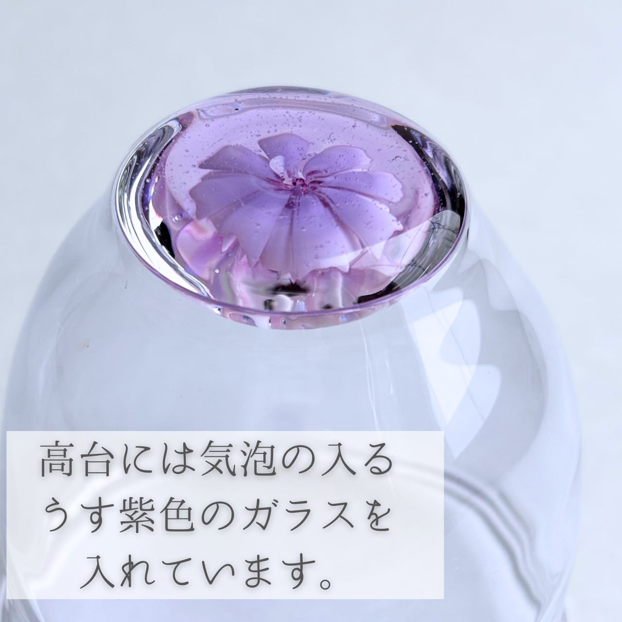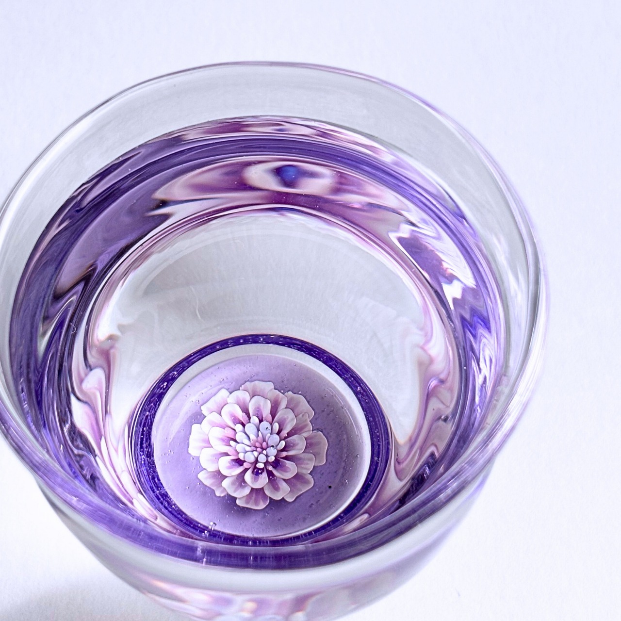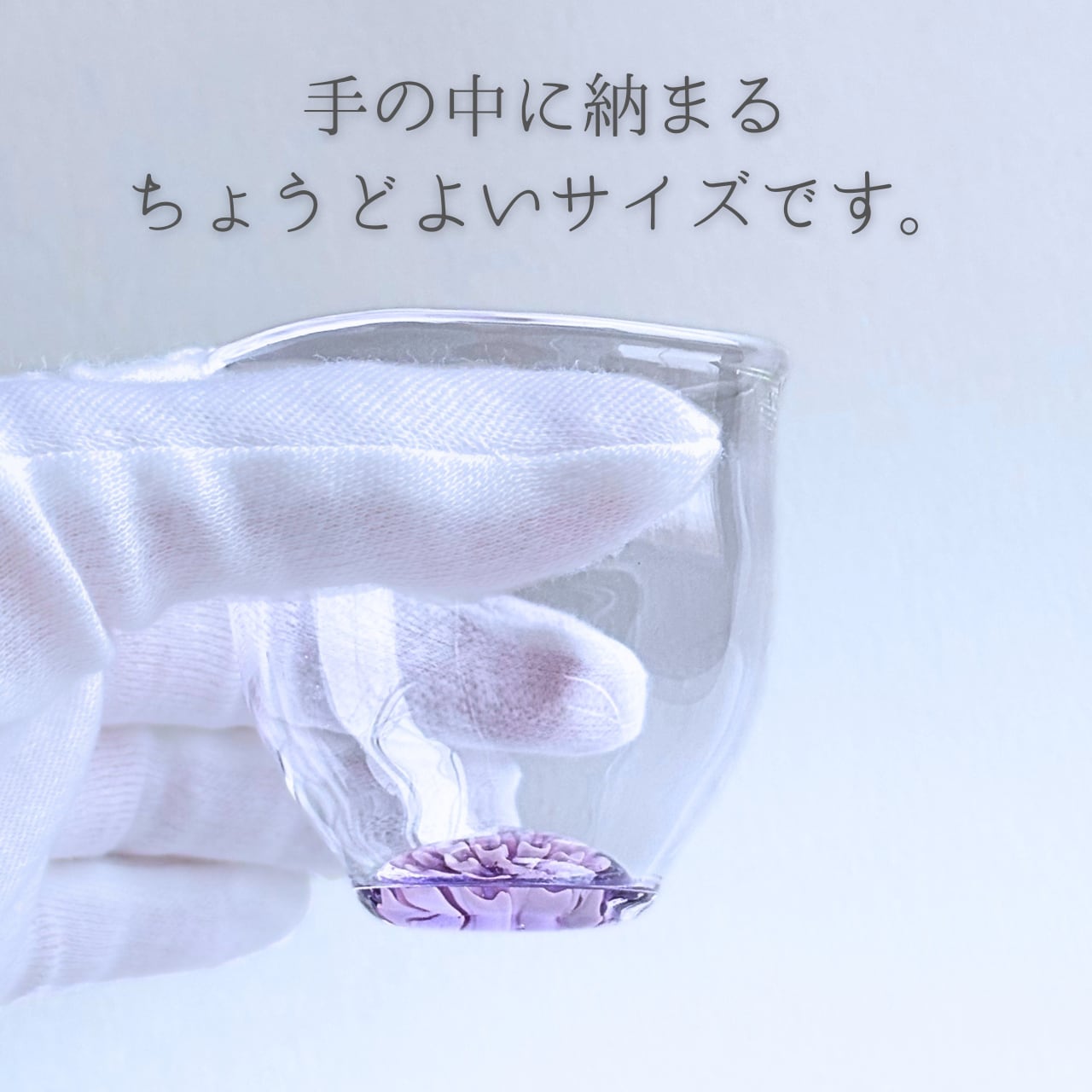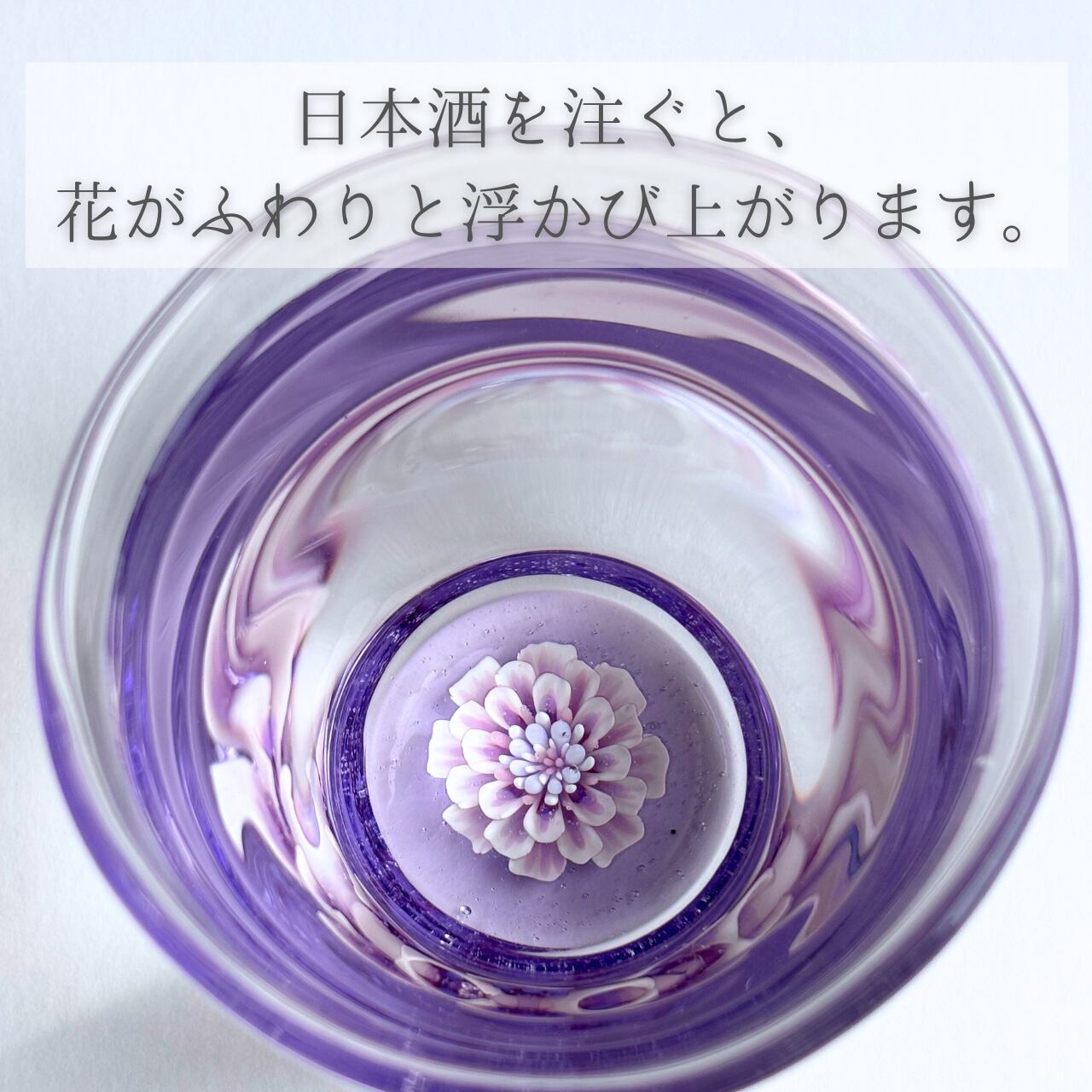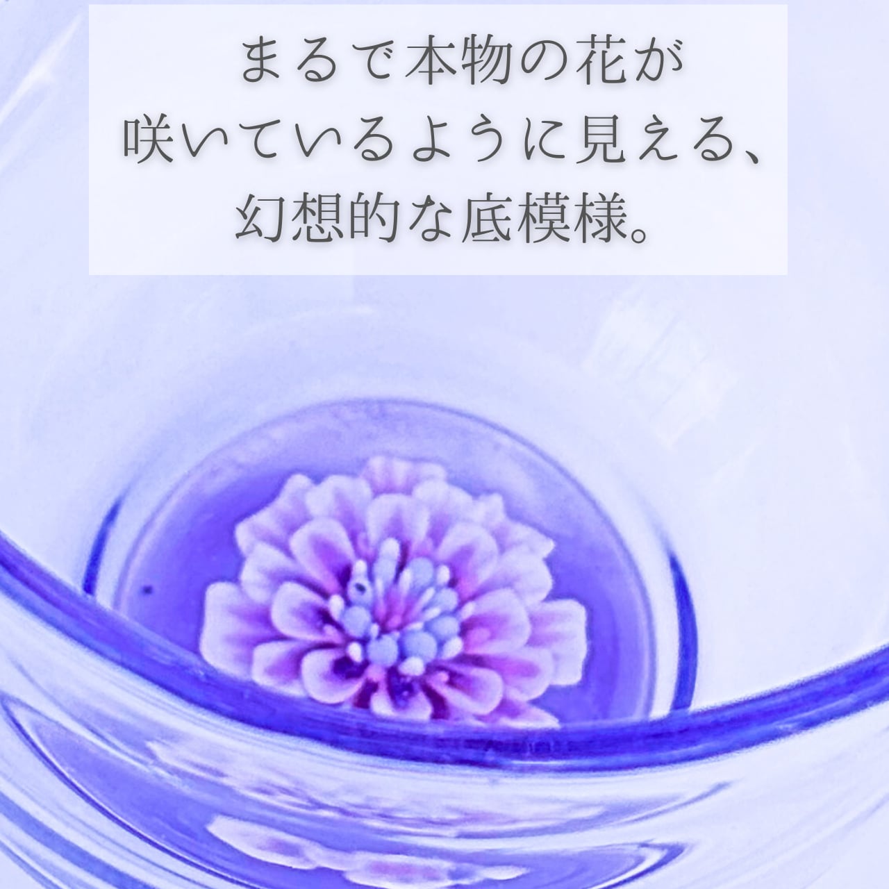 うす紫色のガラスが、美しさを際立たせる酒器グラスです。底に立体的に咲く淡いピンク色の花が、まるで夢の中にいるかのような幻想的な景色を作り出します。