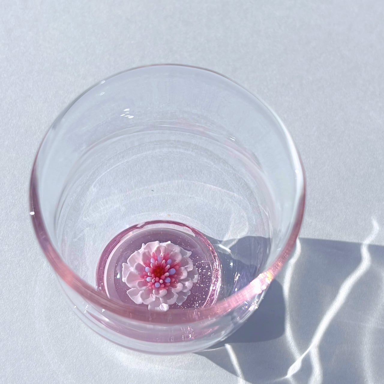 優美なうす桃色の花が、底に立体的に咲いた酒器グラスです。