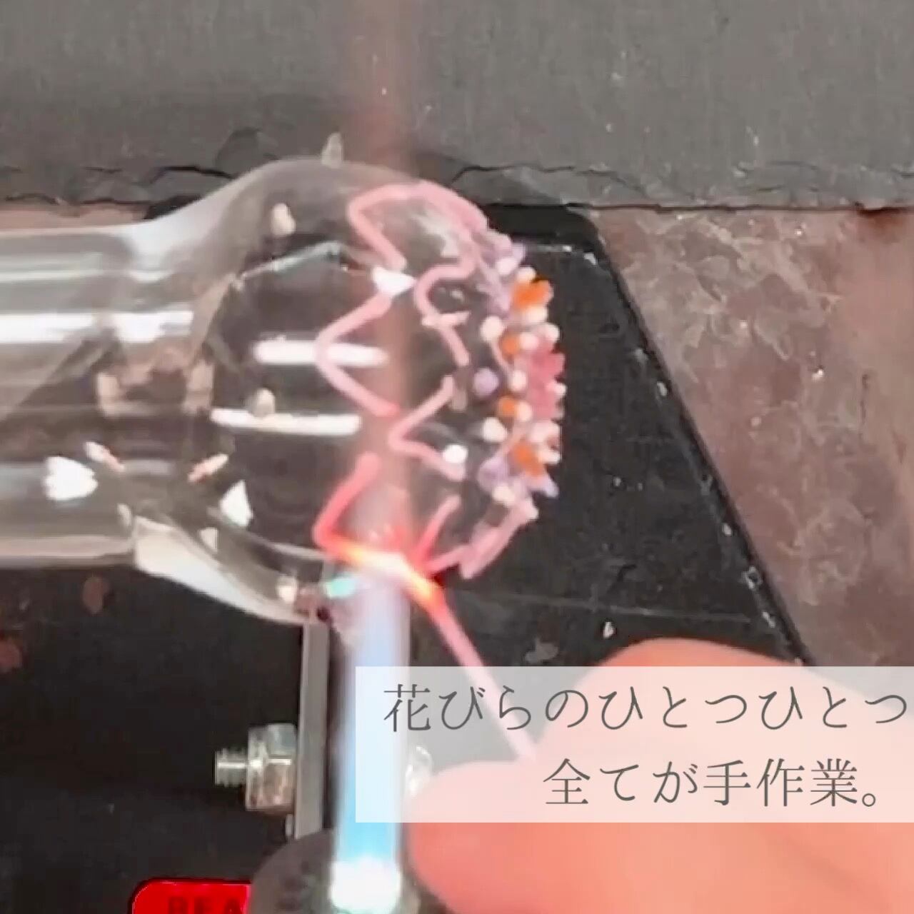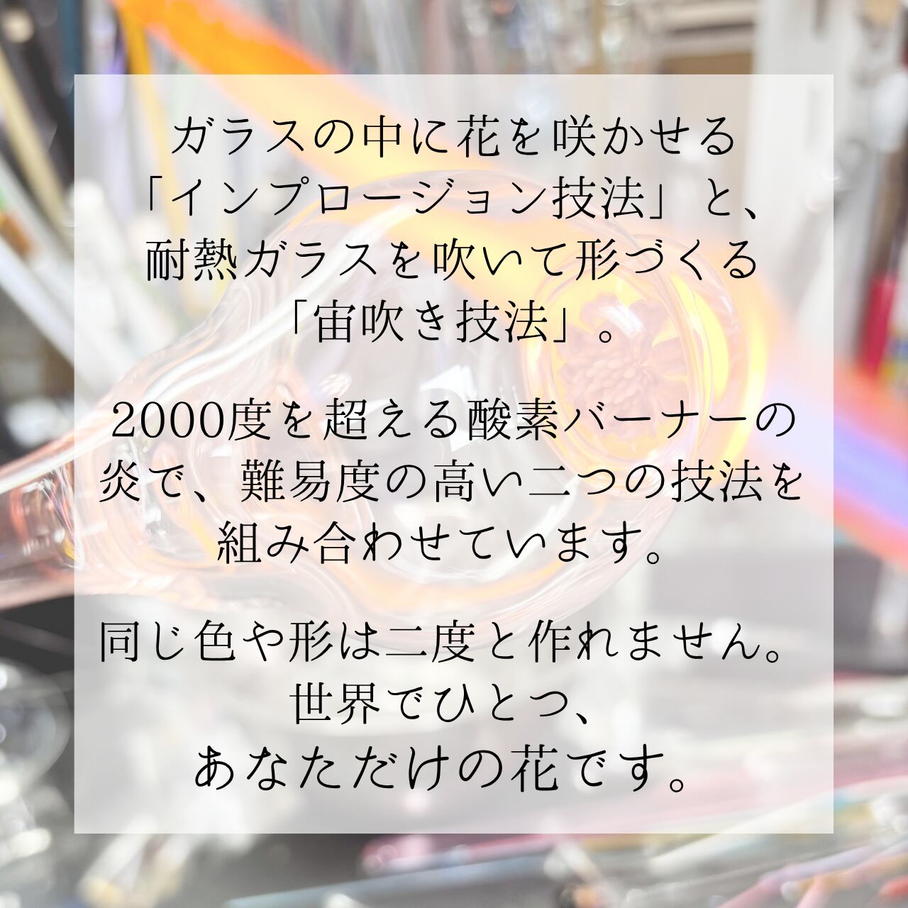 この商品は、酸素バーナーを用いた吹き技法で職人が一つ一つ丁寧に手作りしております。